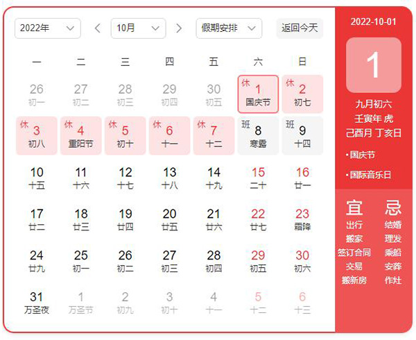 2022年10月1日至7日放假調休,共7天。10月8日(星期六)、10月9日(星期日)正常上班。需要提前安排發貨、訂貨的新老客戶需提前與我司相關工作人員做好溝通,節假日期間我司只接單不發貨。